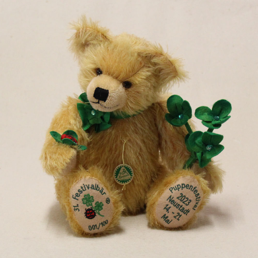 Die Idee des Festivalbären ® wurde 1992 zum 1. Neustadter Puppenfestival von unserem alten Firmenchef Rolf-G. Hermann geboren, um dieses Event weit über die Grenzen unserer Region hinaus bekannt zu machen. Seither wird jedes Jahr zum Neustadter Puppenfestival von uns ein besonderer Festivalbär ® gestaltet. Auch dieses Jahr wartet wieder ein außergewöhnlicher Festivalbär ® auf die Besucher des Neustadter Puppenfestivals, der sich einem aktuellen Thema gleichermaßen widmet wie der alten Tradition der Spielzeugherstellung. So steht unser diesjähriger Festivalbär ® ganz im Zeichen der schützenswerten Natur. Mit den Glückssymbolen, den vierblättrigen Kleeblättern und dem kleinen Marienkäfer, führt uns der Festivalbär ® 2023 im Wonnemonat Mai das kleine Glück vor Augen, das uns die Natur schenkt. Sowohl die Kleeblätter als auch der Marienkäfer sind mit Swarovski Kristallen verziert, in denen sich das Licht und die Sonne spiegeln.